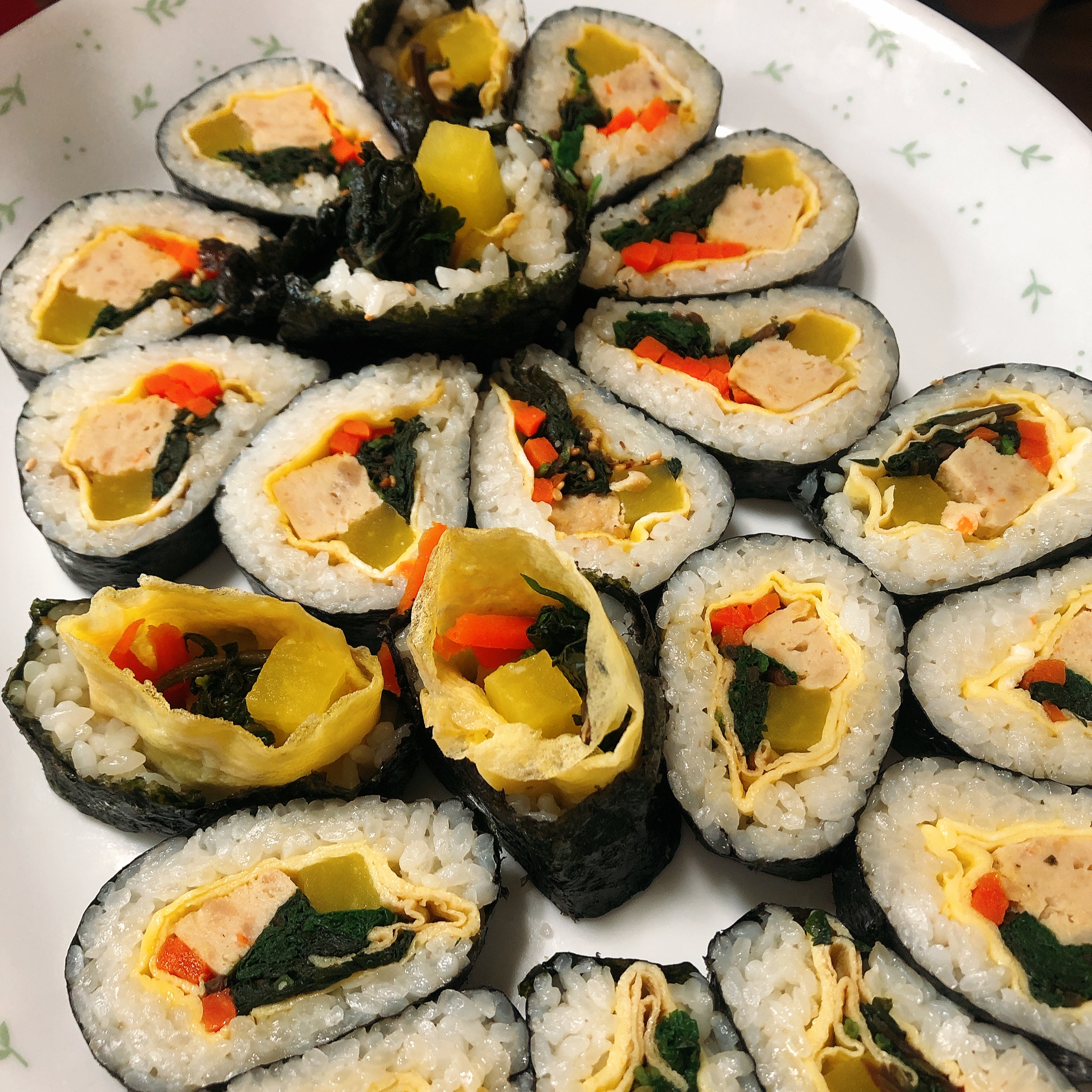 저렇게 닭가슴살 이랑 시금치또는 초록잎채소 +당근+ 단무지+ 맛있는 밥 (<-이게 중요!!!!⭐️⭐️압력밥솥 한 갓한 밥이 진리입니다 여러분 김밥은 밥알맛이 진리여요 거기에 참기름과 약간의 소금을 섞으면 완벽해짐) +계란 +김밥용김
