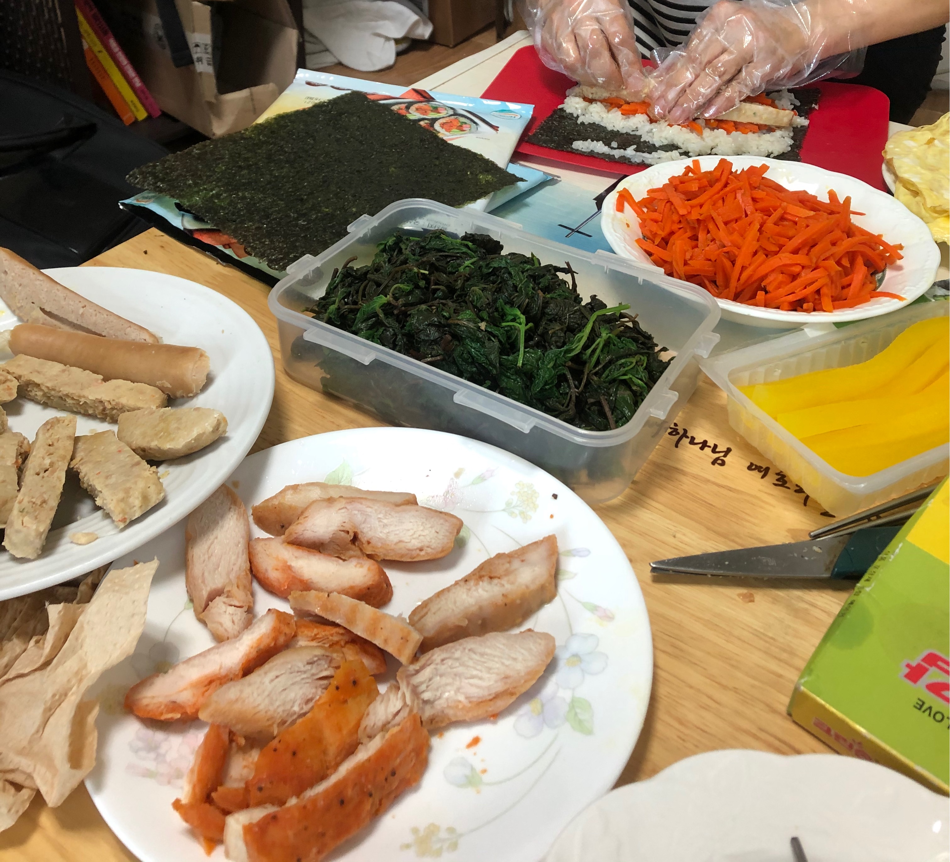 아침에 닭가슴살 집에 소세지있는것들과 채소들로 김밥을 한다고 하셔서 돌돌이 마는 모습을 지켜보면서 냠냠 했답니다